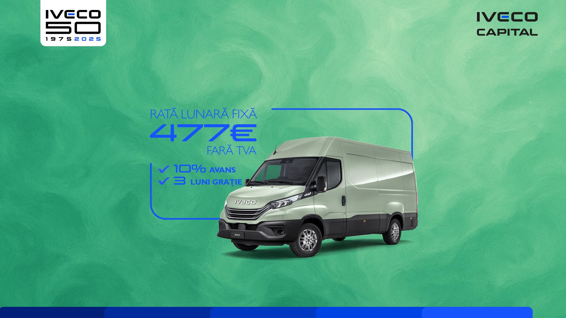 Rata de 477,19 EUR/lună fără TVA a fost calculată pentru vehicul IVECO DAILY FURGON 35S14V de 16m3, cu un avans 10%, durata contractului de finanțare de 5 ani și o valoare reziduală de 20% - care nu este condiționată de o garanție tip buy-back. Perioadă de grație de 3 luni (aplicată doar la capital).