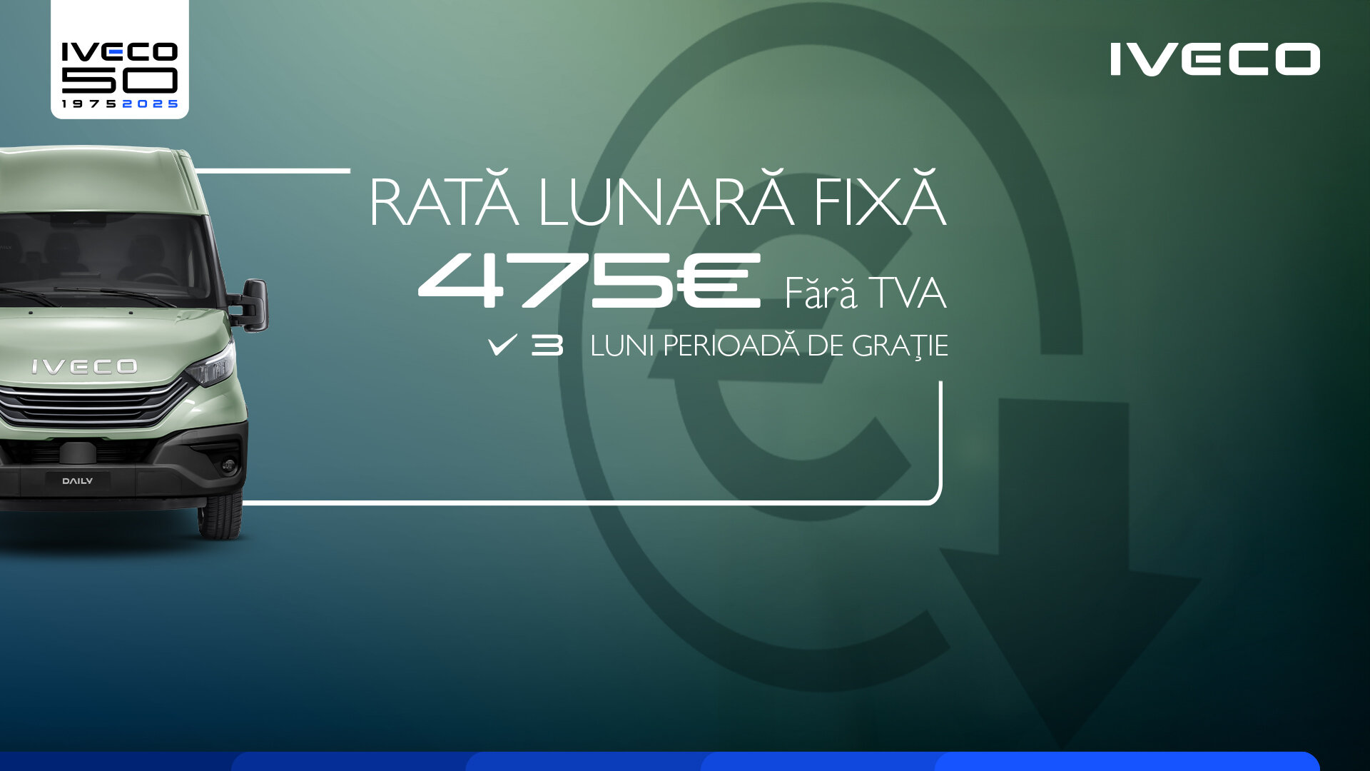 În limita a 3 unități/ client sub rezerva analizei dosarului de finanțare.. Înainte de a accepta finanțarea, este necesară citirea Condițiilor Contractuale și a Fișelor Informative disponibile la dealerii participanți. Este posibilă personalizarea ofertei cu alte sume și durate direct la dealeri IVECO. Finanțarea este asigurată de o companie de leasing autorizată.