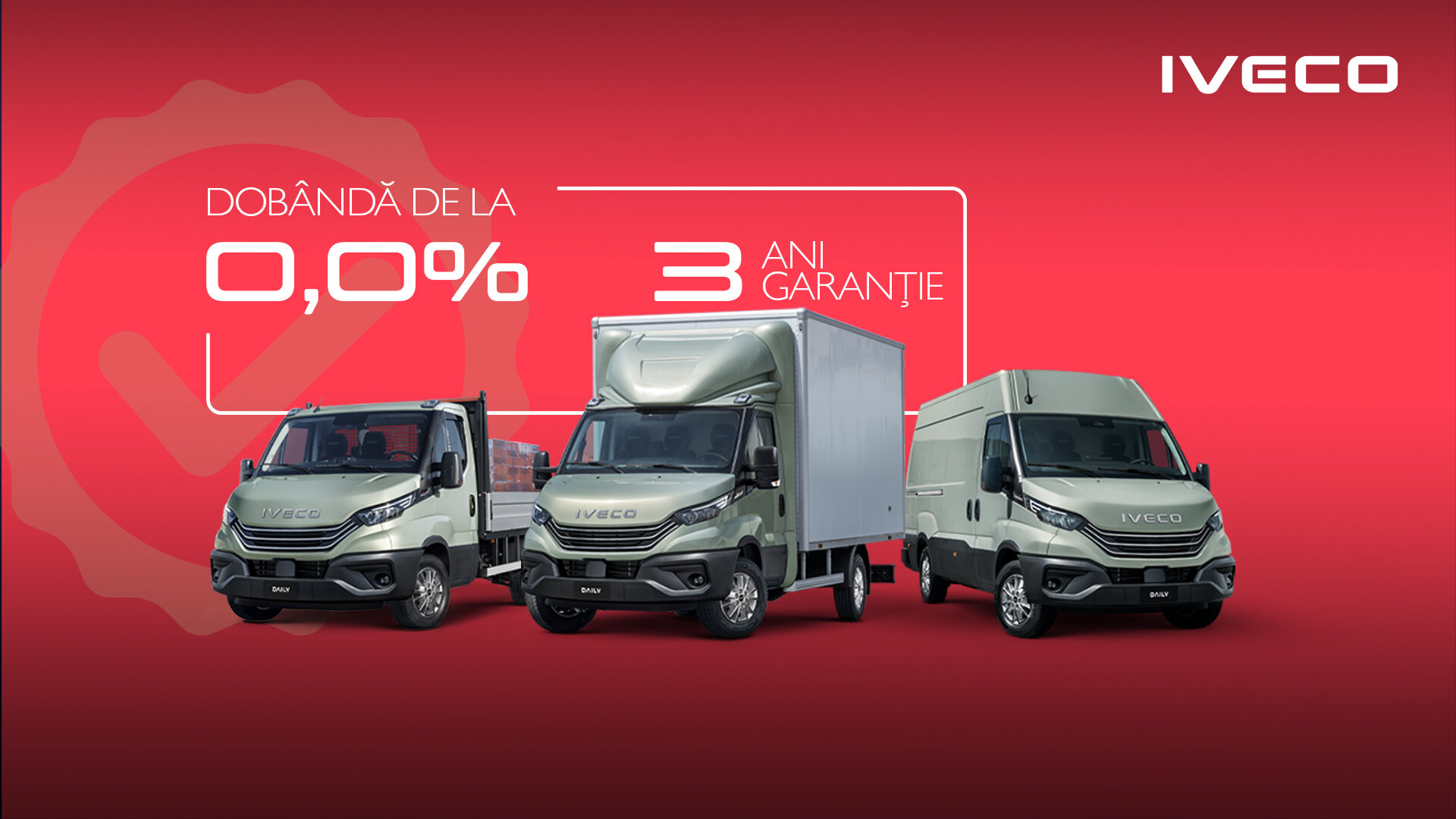 Ofertă valabilă până la 30/06/2025 la dealerii IVECO din România şi structurată după cum urmează: Leasing cu avans 10% pentru orice vehicul din gama DAILY cu dobândă de: